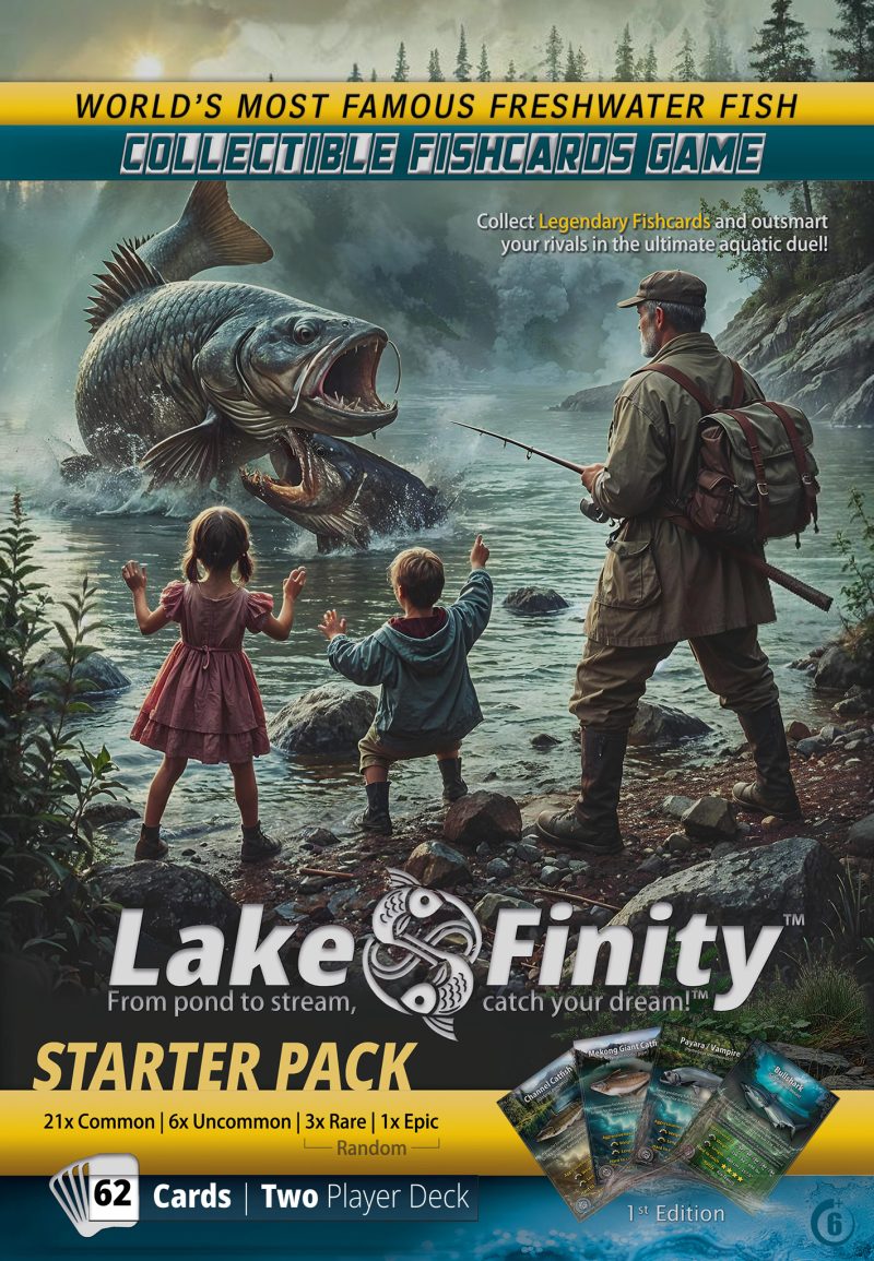 1st Edition of LakeFinity cards available as Starter Deck. Gamebox contains 62 cards (2×31) which is the exact number of cards needed for TWO players to play this game.